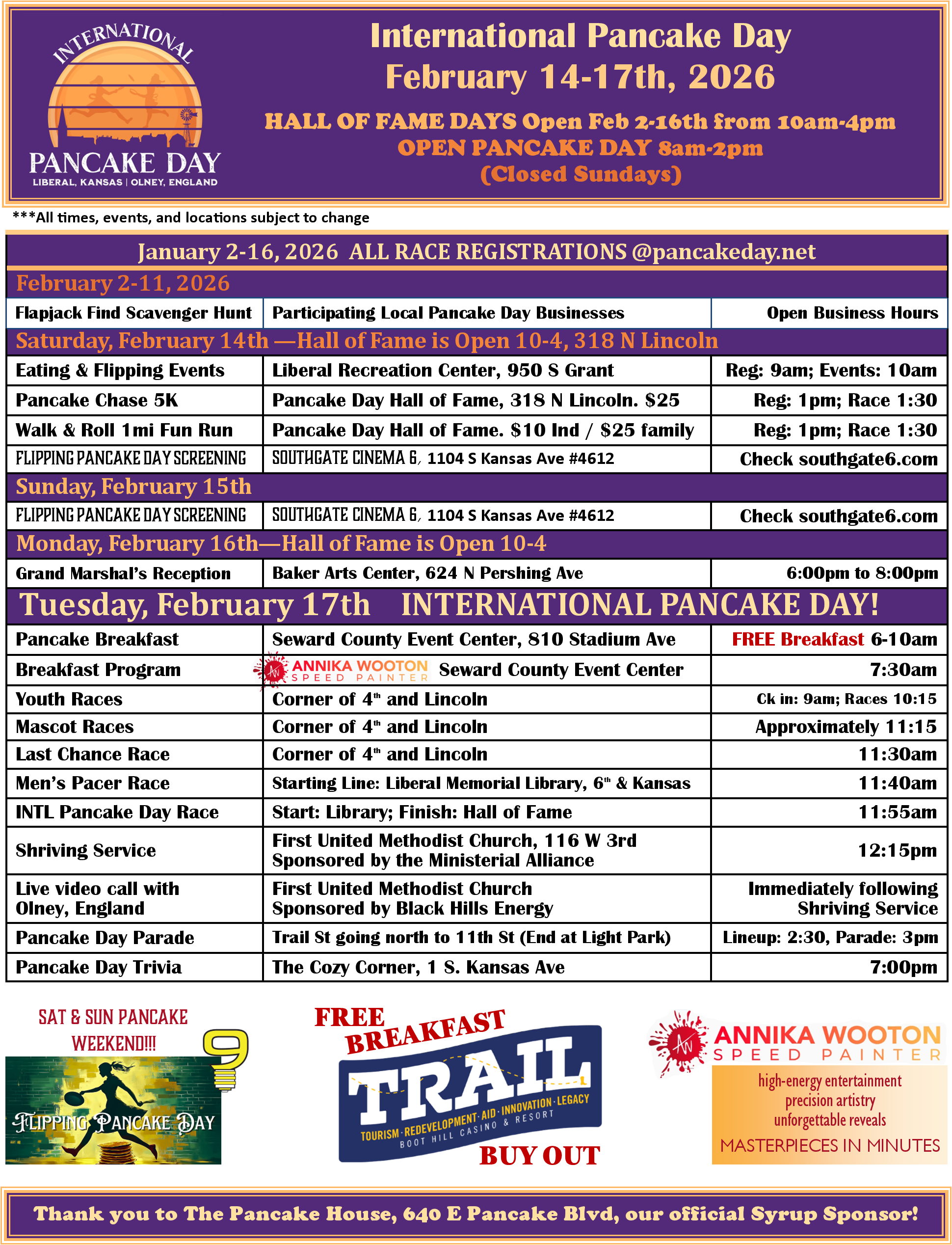 Welcome to the official website for International Pancake Day in Liberal, Kansas! Pancake Day, celebrated on Shrove Tuesday, is a time-honored tradition that began as a way to use up rich and fatty ingredients before Lent. Since 1950, we’ve run in the legendary Pancake Race—a friendly competition against Olney, England, that has connected our communities for over 75 years. Join us in honoring this unique blend of history, culture, and deliciousness!