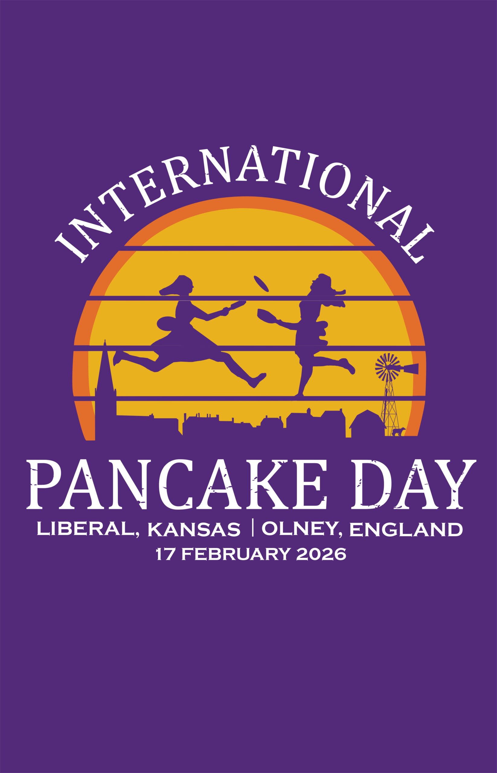 The Official Shirt of 2026 featuring the 2026 logo on a Purple colored garment. This year’s logo features the skyline of Olney, England with a touch of Southwest Kansas agriculture blended in front of a pancake sunset!